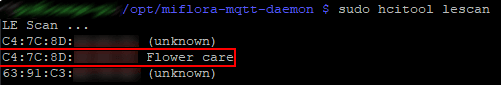 Next step is to scan for available devices using sudo hcitool lescan. The output should look like this and the sensors should appear as a Flower care device in the list.